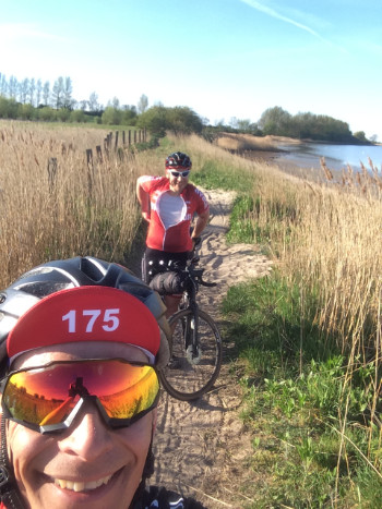 Wir radeln durch Wälder, alte Ackerwege, Pferdetrails, Schotterpisten und Sandwege - so gut wie kein Asphalt. Es ist herrlich, die Sonne strahlt bei 23 Grad und da wir abwegig unterwegs sind, treffen wir auf so gut wie keine Autos. Wir überholen mehr und mehr Fahrer. Viele waren aufgrund einer leicht hysterischen Diskussion auf Facebook schon vorab gestartet. Was in Ordnung geht, da es offiziell kein Rennen ist, sondern ITT (individual time trial). Wir holen ein Tandem ein, auf dem ein gutgelauntes Pärchen sitzt und mit der Kraft der 4 Beine tüchtig reintritt. Mit denen und zwei weiteren Fahrern geht es bis nach Lübeck, wo wir in einen Bus steigen, um unter der Trave hindurch zu fahren. Und es geht immer weiter. Wir halten hin und wieder für Bananen, ne Flasche Cola und zum Auffüllen der Wasservorräte. Lukas und ich fangen an, in Gespräche über unsere Arbeit einzusteigen. Es ist interessant und wir plaudern ewig, die Stunden und die Kilometer fliegen dahin.